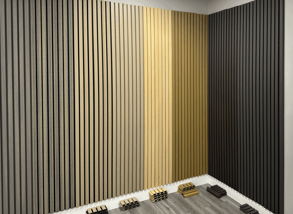 HighlanderFLA offers 13+ Interior Acoustic Slat Wall Options, Exterior WPC Panels, and accessories like trim, strip lights and mountings.